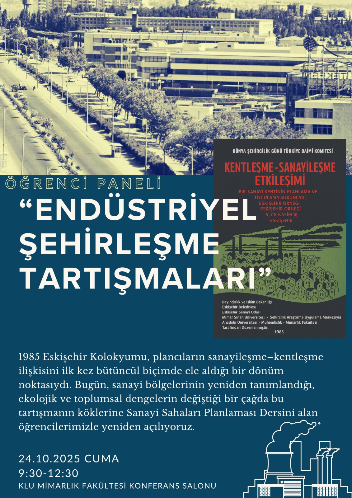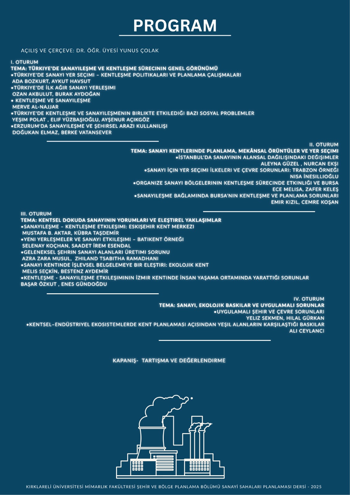 Kırklareli Üniversitesi Mimarlık Fakültesi Şehir ve Bölge Planlama Bölümü öğrencileri, “Sanayi Sahaları Planlaması” dersi kapsamında hazırladıkları sunumlarla 1985 Kolokyumu’nda yer alan tebliğleri günümüz planlama anlayışıyla yeniden değerlendiriyorlar.