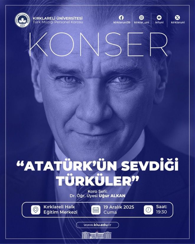 Üniversitemiz bünyesinde çalışmalarını sürdüren Türk Müziği Personel Korosu tarafından düzenlenen “Atatürk’ün Sevdiği Türküler” başlıklı konser, 19 Aralık 2025 Cuma günü Kırklareli Halk Eğitim Merkezinde gerçekleştirilmiştir. Dr. Öğr. Üyesi Uğur Alkan’ın şefliğinde icra edilen bu anlamlı gecede, Gazi Mustafa Kemal Atatürk’ün sevdiği türkülerden oluşan repertuvar seslendirilmiştir.