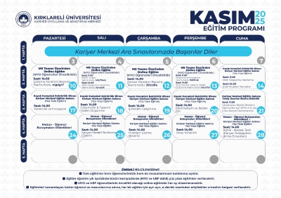 ![]() | KARİYER MERKEZİ KASIM 2025 EĞİTİM PROGRAMI YAYINLANDI Kariyer Uygulama ve Araştırma Merkezi 22/10/2025 370 Okunma |